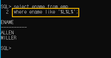 3) 문자열 연산자: like + ( %는 모든문자, _(언더바)는 한자리를 차지한다는 의미 )