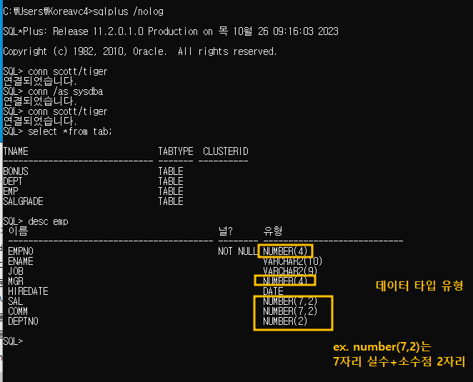 - 정수: number(3) -->3자리 정수공간, number(7) --> 7자리 정수공간