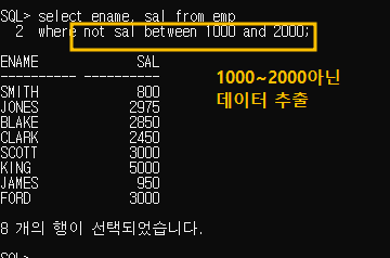 예제3) 급여가 1000~2000가 아닌 사람을 추출
