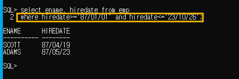 예제5) 입사일이 '87/01/01'~'23/10.26'인 사람추출(날짜 제한)