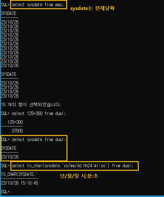 - date: 8byte(연/월/일)로 구성됨. ex. '23/10/26' Oracle에선 23년 10월 26일 로 인식함.
