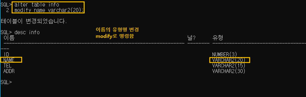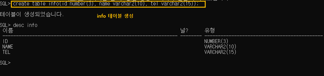 SQL> create table info(id number(3), name varchar2(10), tel_varchar2(15);