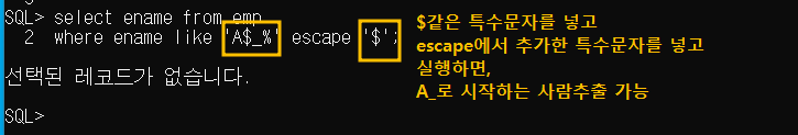2 where ename like 'A$_%' escape '$'; -- $같은 특수문자를 넣고, escape에서 추가한 특수문자를 넣고 실행하면, A_ 로 시작하는 데이터 추출가능