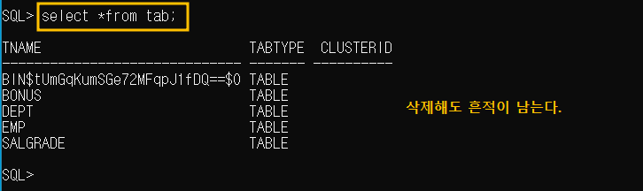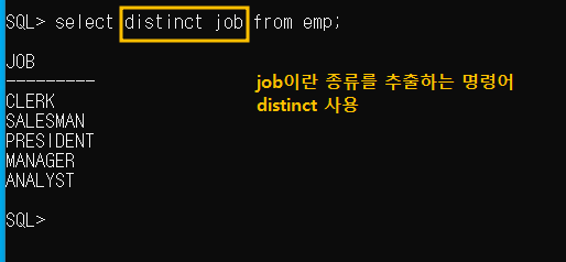 SQL> select distinct job from emp -- distinct는 뒤에 오는 컬럼명을 추출하는 명령어