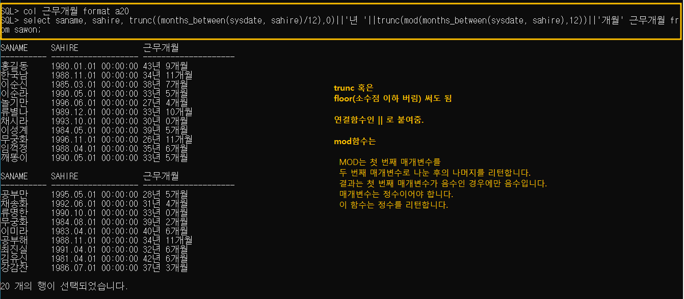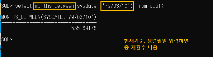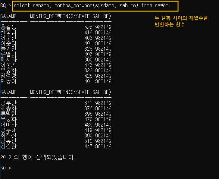 SQL> select saname, month_between(sysdate, sahire) from sawon;
