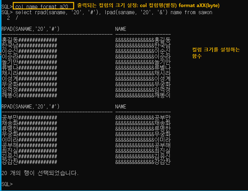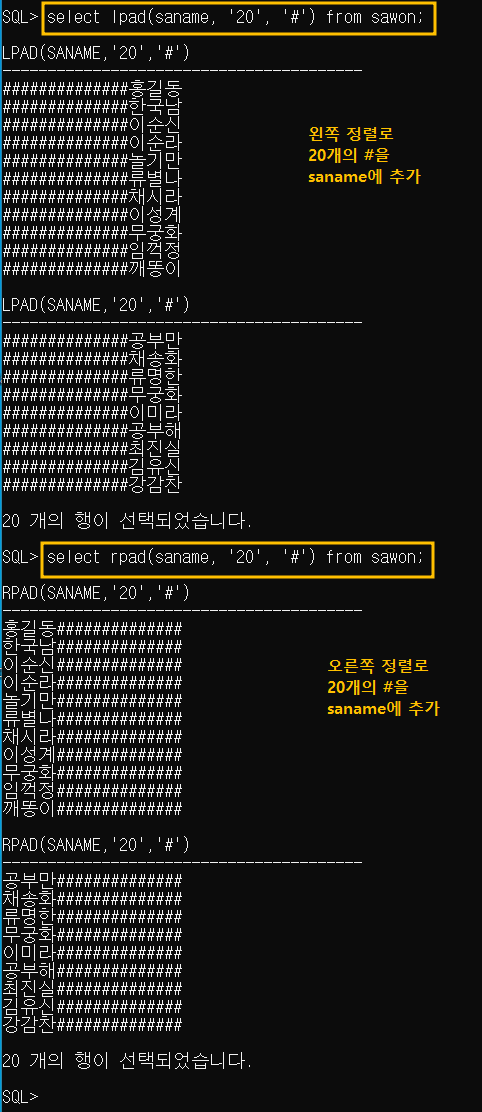 lpad & rpad(데이터, 전체 크기, '채울 문자') --> lpad는 왼쪽에 채움 / rpad는 오른쪽에 채움.