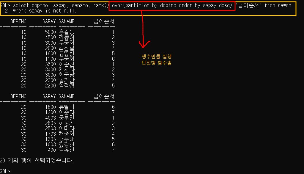 형식: rank() over( [partition by 컬럼명-삭제 가능하며, 특정컬럼 넣을때 입력]