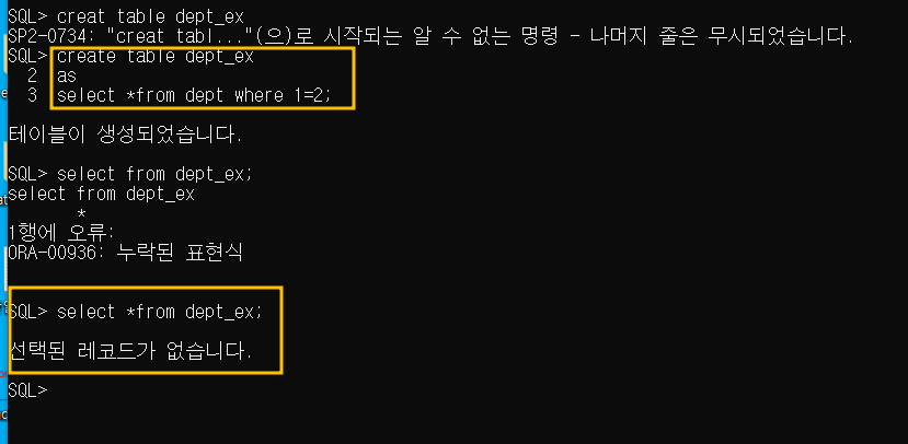 -- 테이블 구조만 복사하는 경우 조건절을 부정형으로 해서 출력하면 됨.