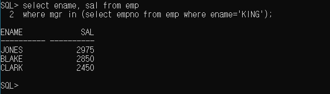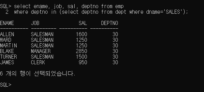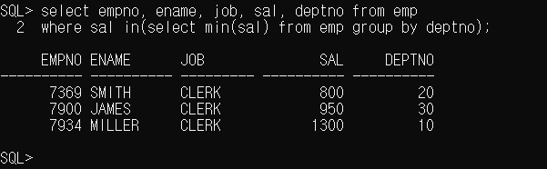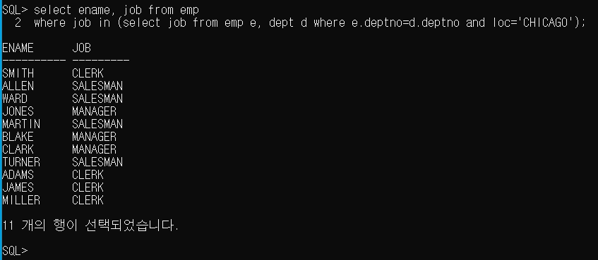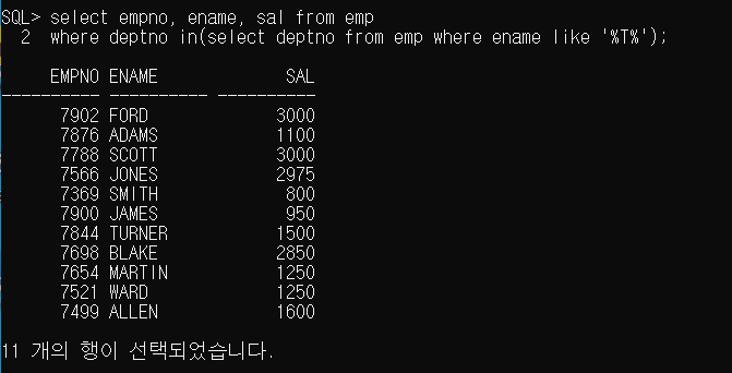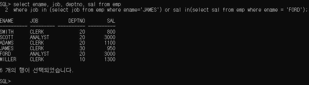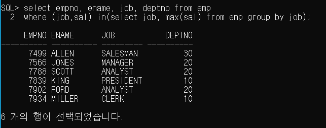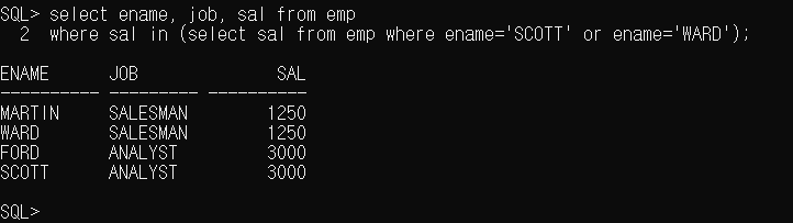 SQL> select ename, sal, nvl(comm,-1) from emp where (sal, nvl(comm, -1)) in (select sal, nvl(comm, -1) from emp where deptno =30) and deptno <>30;(정답3)