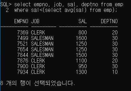 3. EMP 테이블에서 급여의 평균보다 적은 사원의 사원번호, 이름, 업무, 급여, 부서번호