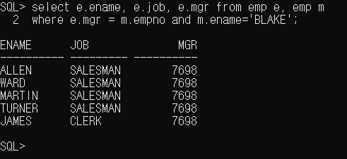 SQL> select e.ename, e.job, e.mgr from emp e, emp m