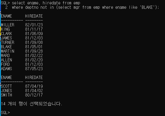 where deptno not in (select mgr from emp where ename like ‘BLAKE’);