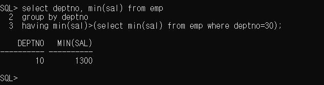 having min(sal)>(select min(sal) from emp where deptno=30);