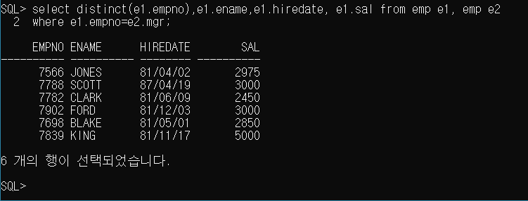 SQL> select distinct(e1.empno),e1.ename,e1.hiredate, e1.sal from emp e1, emp e2