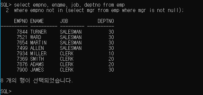 where not exists(select e.mgr from emp e where e.mgr = m.empno);
