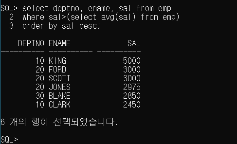 SQL> select job, e.deptno, e.ename, e.sal, 부서평균급여