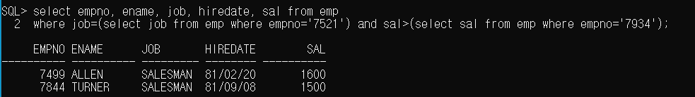 where job=(select job from emp where empno=7521) and sal > (select sal from emp where empno = 7934);