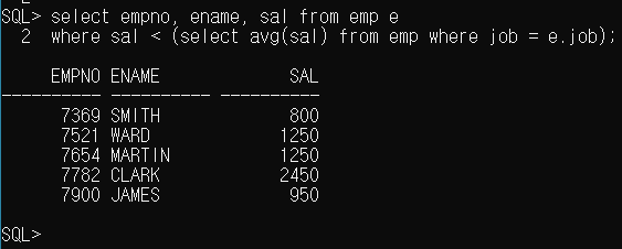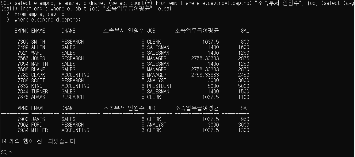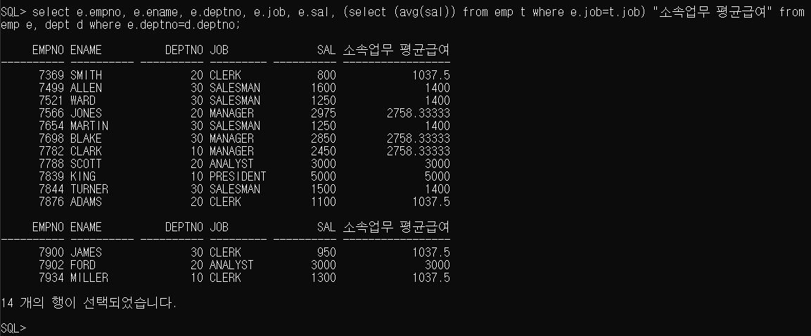 SQL> select e.empno, e.ename, e.deptno, e.job, e.sal, (select (avg(sal)) from emp t where e.job=t.job) "소속업무 평균급여" from emp e, dept d where e.deptno=d.deptno;