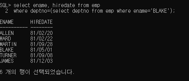where deptno=(select deptno from emp where ename like ‘BLAKE’);