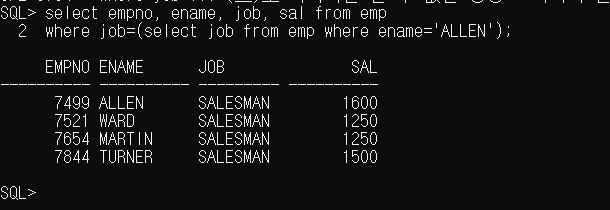 1. 이름이 ALLEN인 사원과 같은 업무를 하는 사람의 사원번호, 이름, 업무, 급여