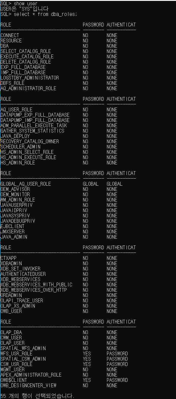 시스템에서 현재 사용중인 롤을 조회하는 SQL을 작성해 보자. (반드시 시스템 계정에서만 조회가 가능하다.)