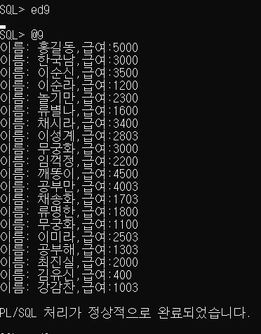 사원 테이블에서 이름과 급여를 출력하시오.(커서 사용)