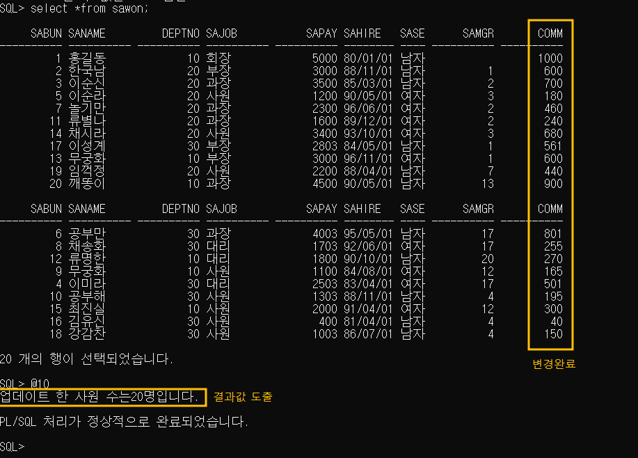 dbms_output.put_line(v_bun||'번 사원의 커미션은' || v_comm || '으로 변경 되었습니다.');