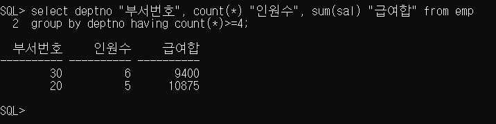 SQL> select deptno "부서번호", count(*) "인원수", sum(sal) "급여합" from emp