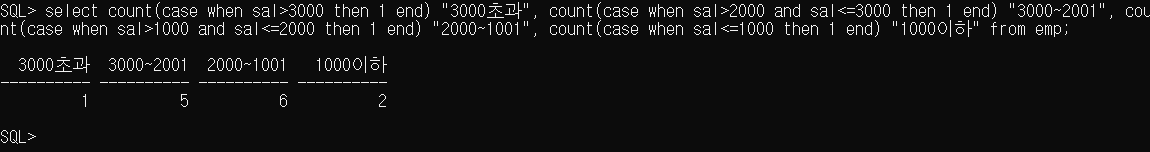 10. 급여가 1000 이하인 인원수,1001에서 2000 사이의 인원수,2001에서 3000 사이의 인원수,3000 초과인 인원수를 출력하시오.