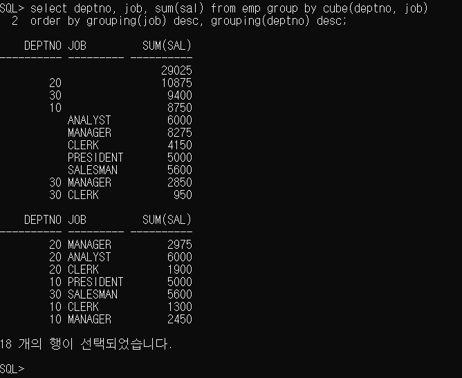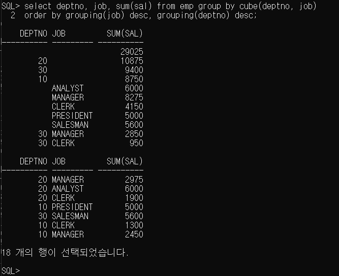 order by grouping(job) desc, grouping(deptno) desc;