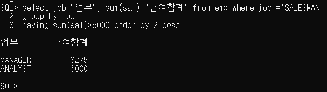 SQL> select job "업무", sum(sal) "급여합계" from emp where job!='SALESMAN'