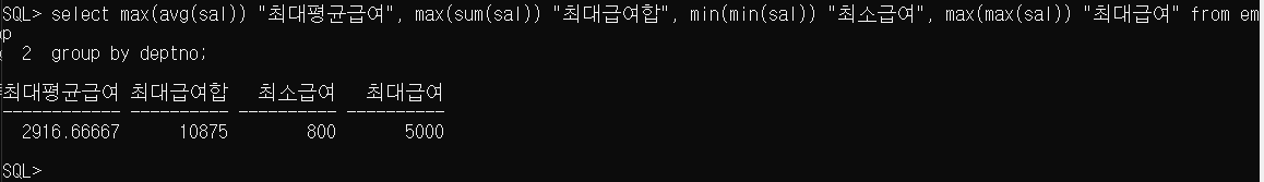 SQL> select max(avg(sal)) "최대평균급여", max(sum(sal)) "최대급여합", min(min(sal)) "최소급여", max(max(sal)) "최대급여" from emp