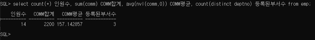 SQL> select count(*) 인원수, sum(comm) COMM합계, avg(nvl(comm,0)) COMM평균, count(distinct deptno) 등록된부서수 from emp;