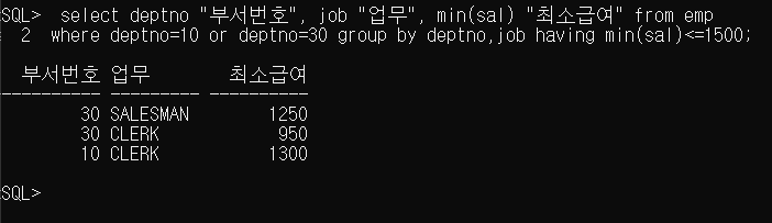 SQL> select deptno "부서번호", job "업무", min(sal) "최소급여" from emp