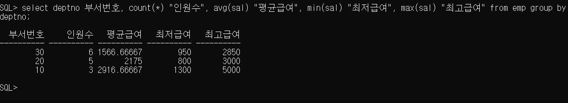 SQL> select deptno 부서번호, count(*) "인원수", avg(sal) "평균급여", min(sal) "최저급여", max(sal) "최고급여" from emp group by deptno;