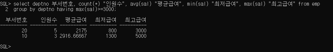 SQL> select deptno 부서번호, count(*) "인원수", avg(sal) "평균급여", min(sal) "최저급여", max(sal) "최고급여" from emp