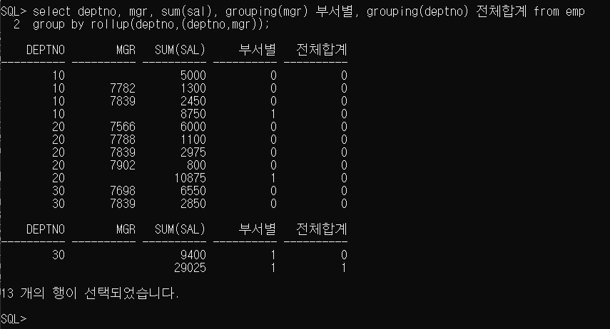 SQL> select deptno, mgr, sum(sal), grouping(mgr) 부서별, grouping(deptno) 전체합계 from emp