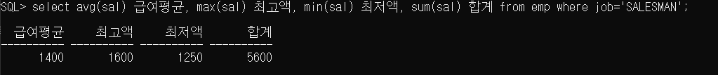 SQL> select avg(sal) 급여평균, max(sal) 최고액, min(sal) 최저액, sum(sal) 합계 from emp