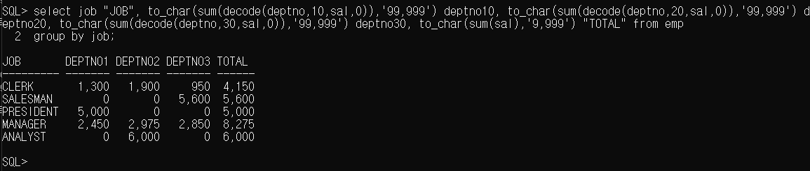 | JOB | DEPTNO 10 | DEPTNO 20 | DEPTNO 30 | TOTAL |
