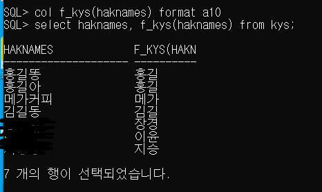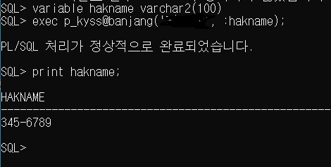 SQL> exec p_kyss@banjang('이름', :hakname);