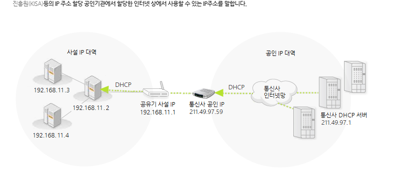 ==> IPv4 주소 부족으로 서브넷팅(sub netwoking)된 IP, 라우터로 변환된 로컬네트워크 PC장치로 할당.