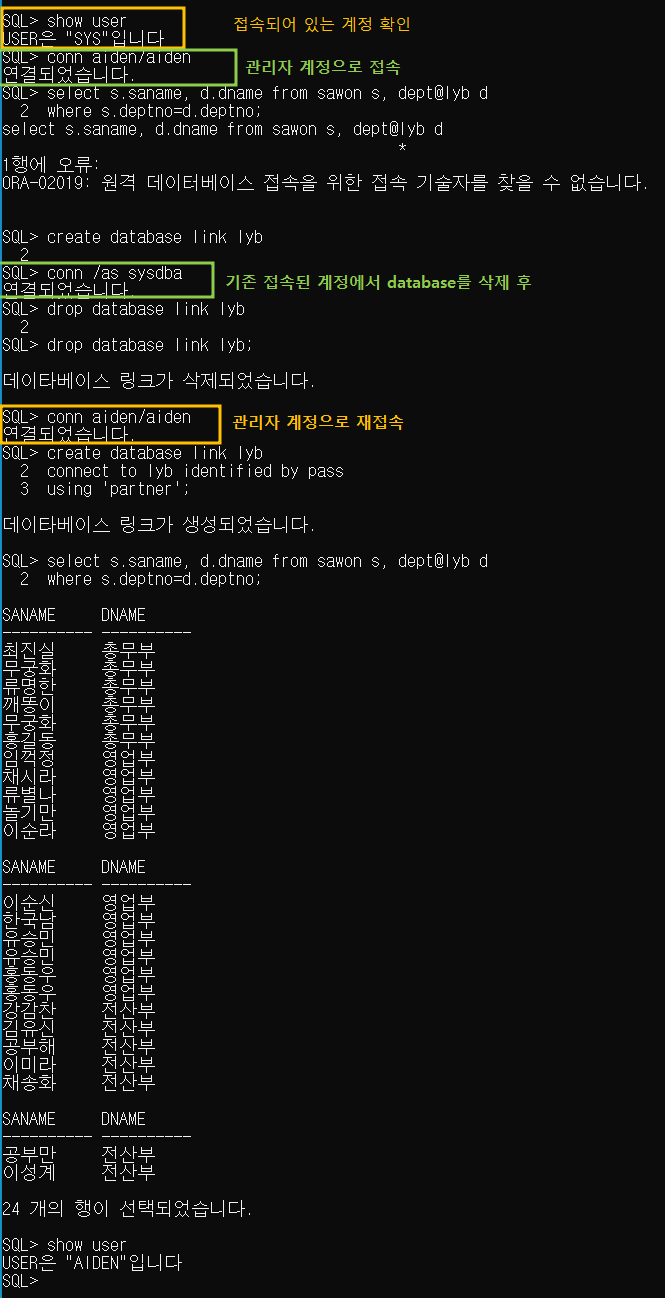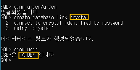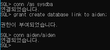 SQL> grant create database link to aiden(계정명); // 권한 부여할 계정명으로 등록