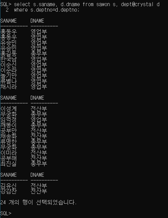 SQL> select s.sname, d.dname from sawon s, dept@crystal d