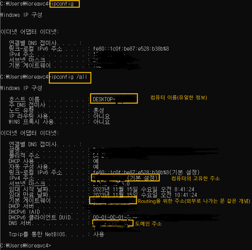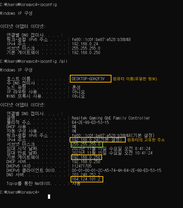 - 고정 IP: 컴퓨터에 고정부여 된 IP. 한번 부여되면, IP반납 전까지 다른장비로 부여할 수 없는 IP주소.
