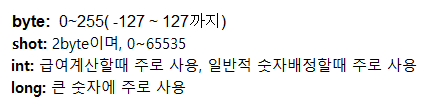 | 정수: ..., -1, 0, 1, ... | byte, short, int, long | |