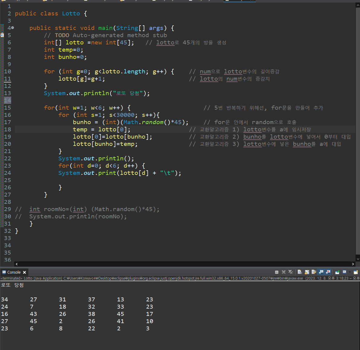 lotto[bunho]=temp; // 교환알고리즘 3) lotto변수에 넣은 bunho를 a에 대입