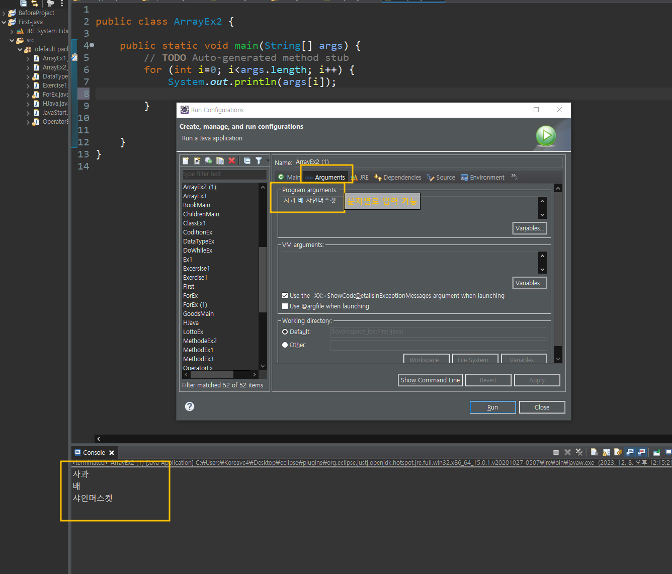 }경로: 우측 마우스 > RUS AS > Run Configirations > Arguments 클릭 > program arguments에 입력할 값 입력 > RUN