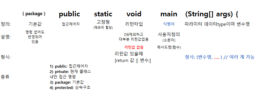 - public : 모든 클래스에서도 해당 변수나 메서드가 접근이 가능하다는 의미로 프로그램의 시작은 main이기 때문에 다른 곳에서도 호출할 수 있도록 public을 사용