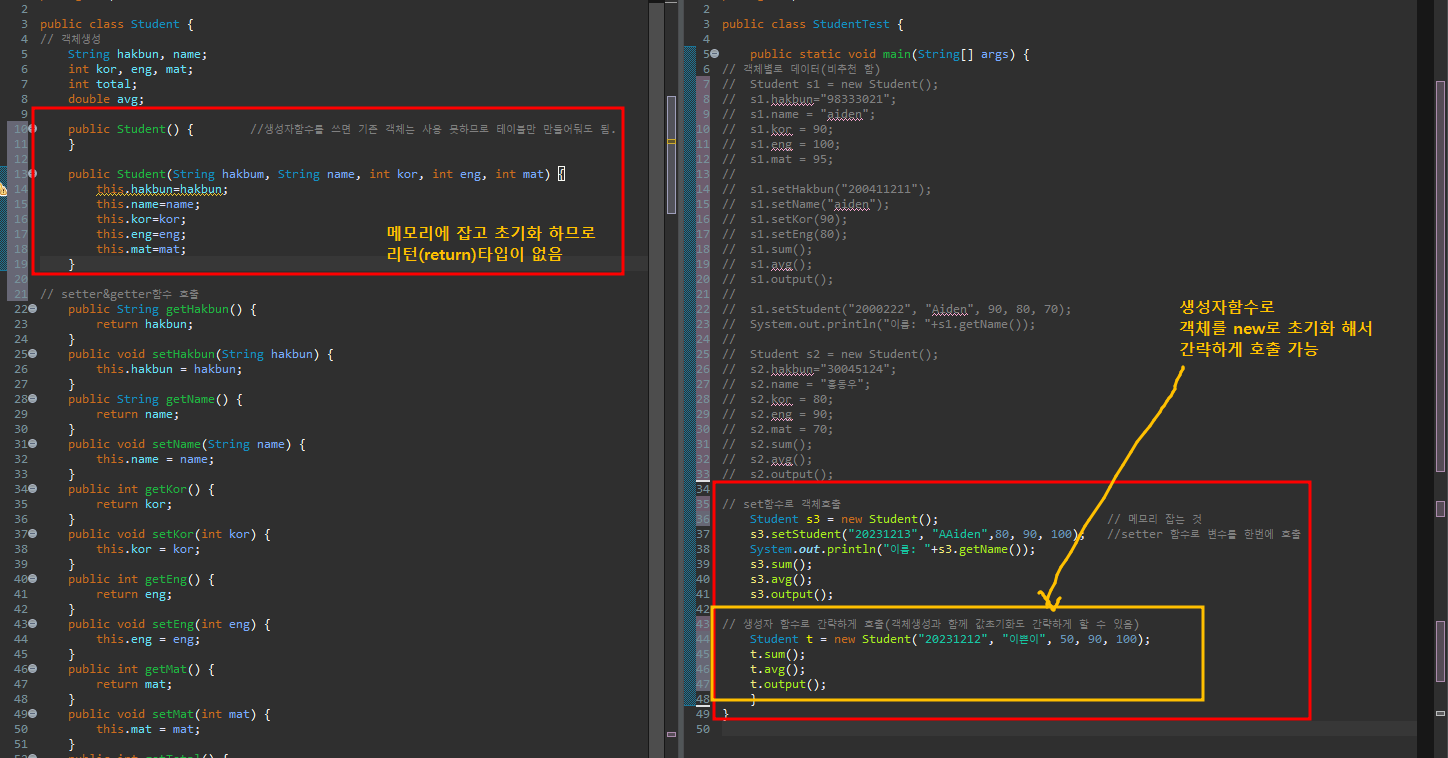 // Main 영역에서 변수 사용하기 [StudentTest class] (Getter&Setter는 객체변수)