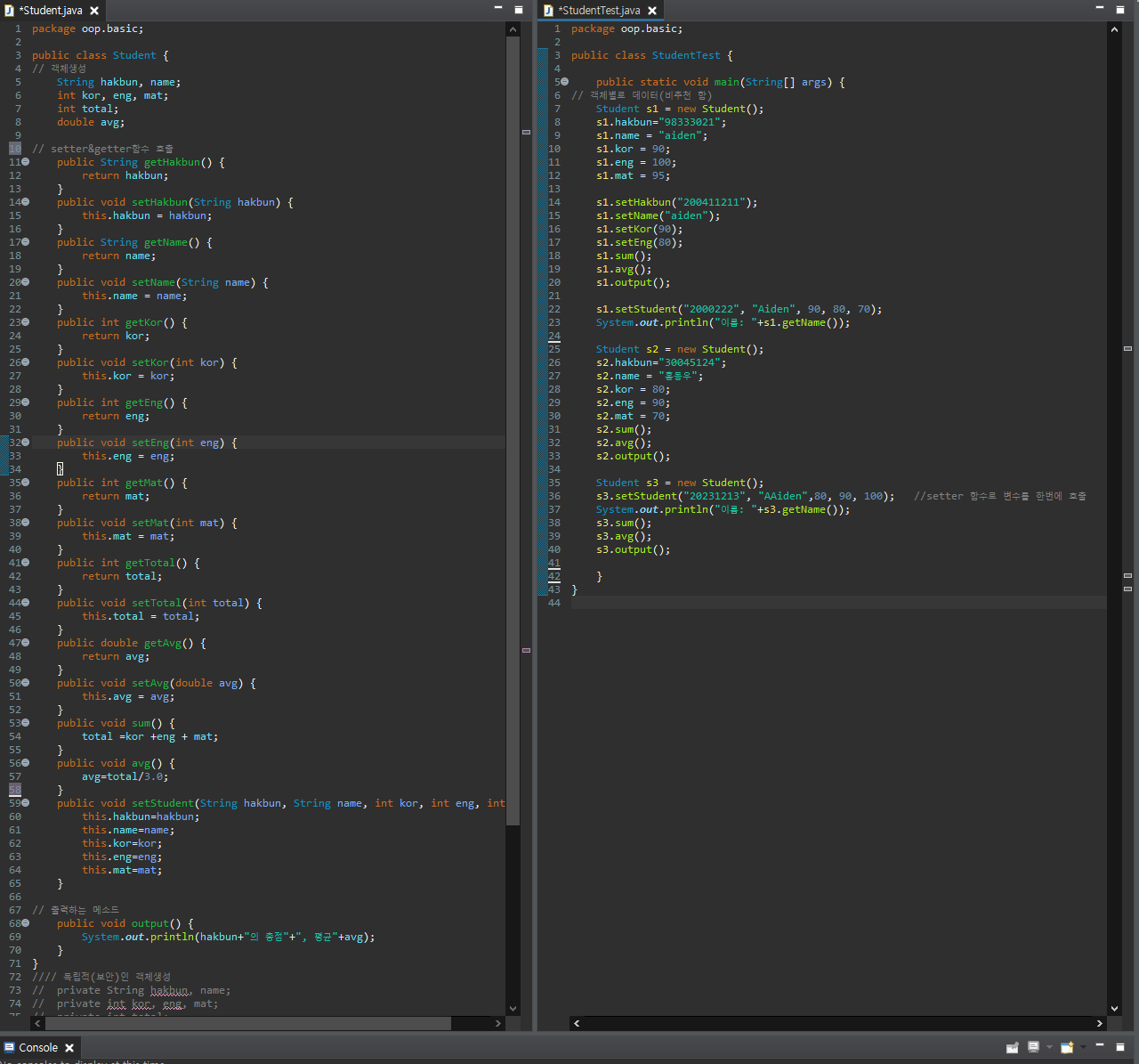 s3.setStudent("20231213", "AAiden",80, 90, 100); //setter 함수로 변수를 한번에 호출